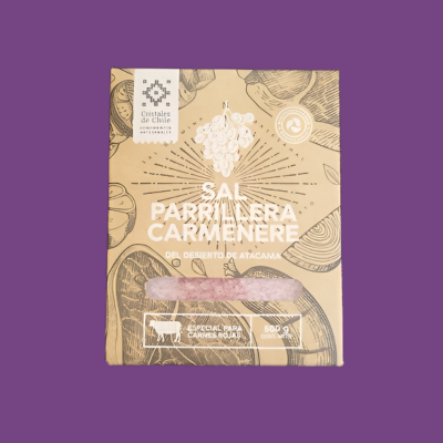 Imagina la fuerza mineral de las minas de sal de San Pedro de Atacama, impregnada con la nobleza de nuestro Carmenere. Esta no es una sal común; es una joya de nuestra tierra. Al ser sal de mina, su estructura cristalina retiene de forma excepcional la esencia y el color del vino, liberando su bouquet de frutos rojos de manera gradual sobre el fuego.